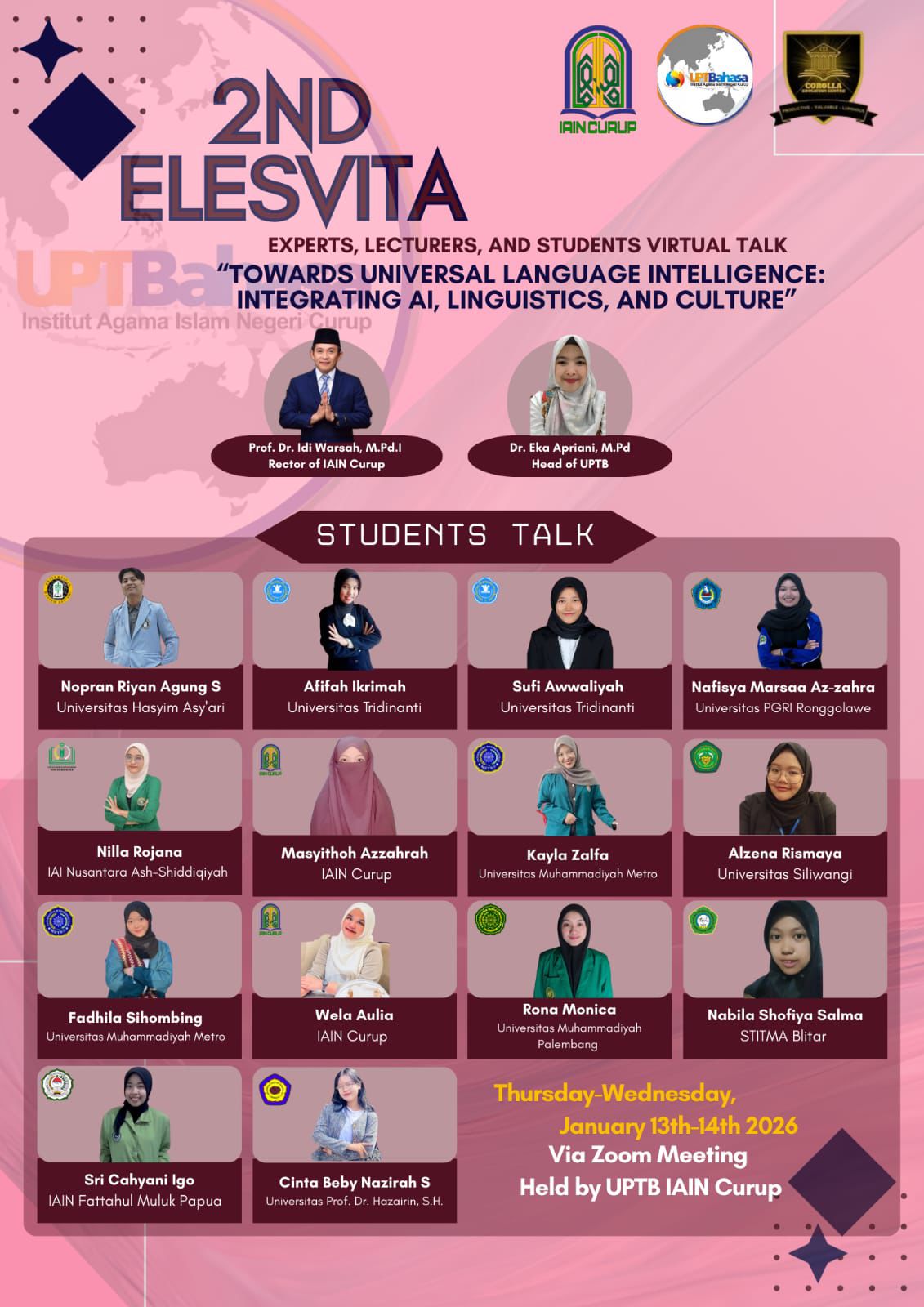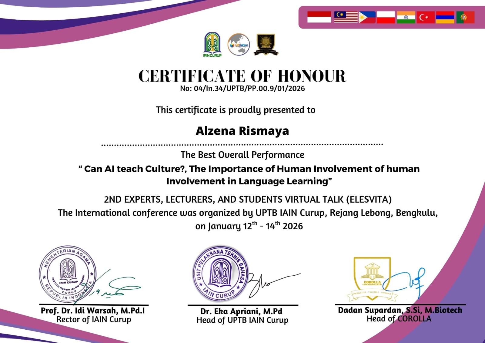 Mahasiswa Program Studi Pendidikan Bahasa Inggris berhasil menorehkan prestasi membanggakan di tingkat internasional. Alzena Rismaya meraih The Best Overall Performance Award pada kegiatan 2nd Experts, Lecturers, and Students Virtual Talk (ELESVITA) yang diselenggarakan oleh UPTB IAIN Curup, Rejang Lebong, Bengkulu, pada 12–14 Januari 2026.