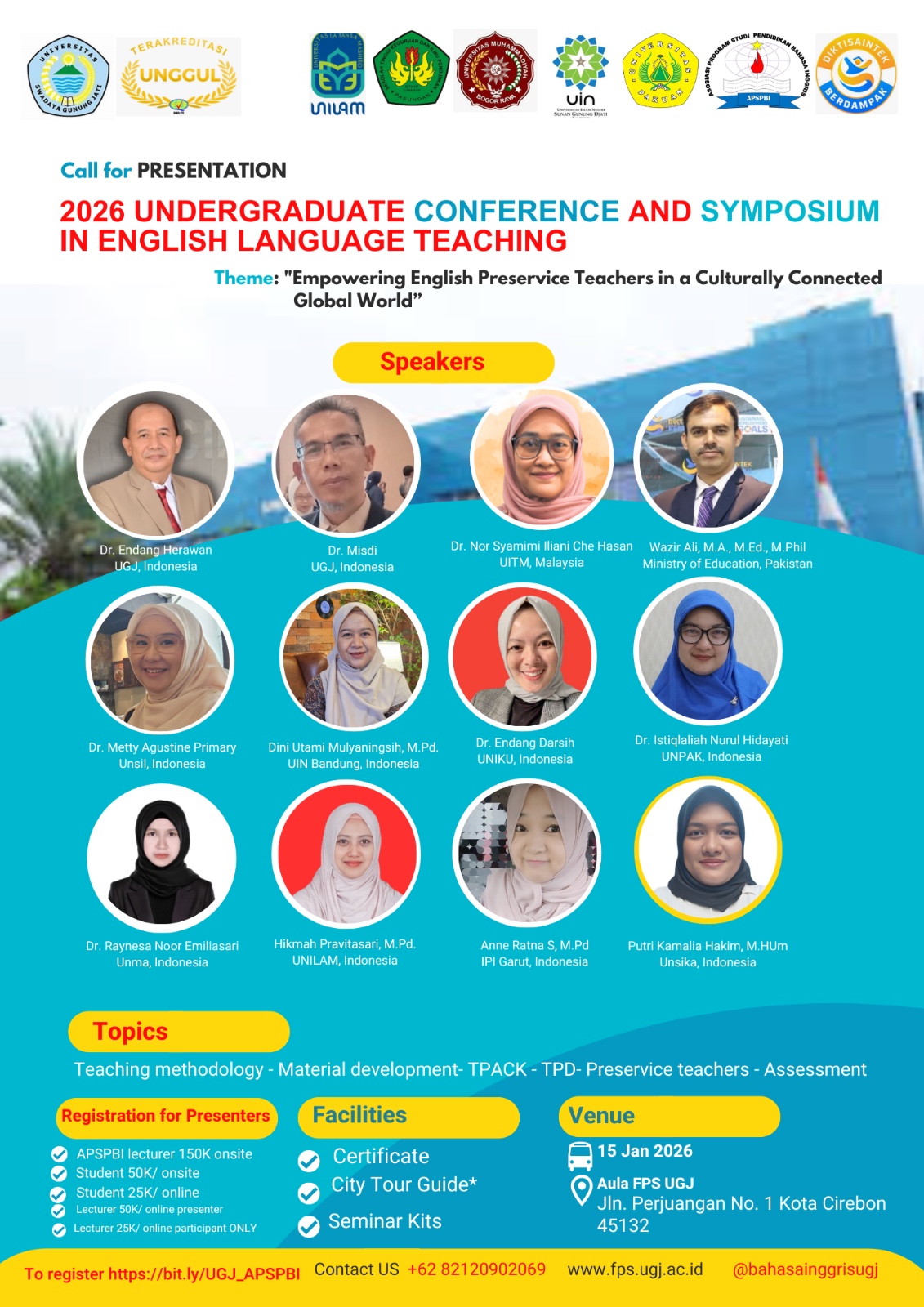 Dosen Program Studi Pendidikan Bahasa Inggris Universitas Siliwangi menunjukkan peran aktif dalam kegiatan 2026 Undergraduate Conference and Symposium in English Language Teaching yang diselenggarakan pada 15 Januari 2026 di Aula Fakultas Pendidikan dan Sastra Universitas Swadaya Gunung Jati (UGJ), Kota Cirebon. Kegiatan ini mengusung tema “Empowering English Preservice Teachers in a Culturally Connected Global World”.