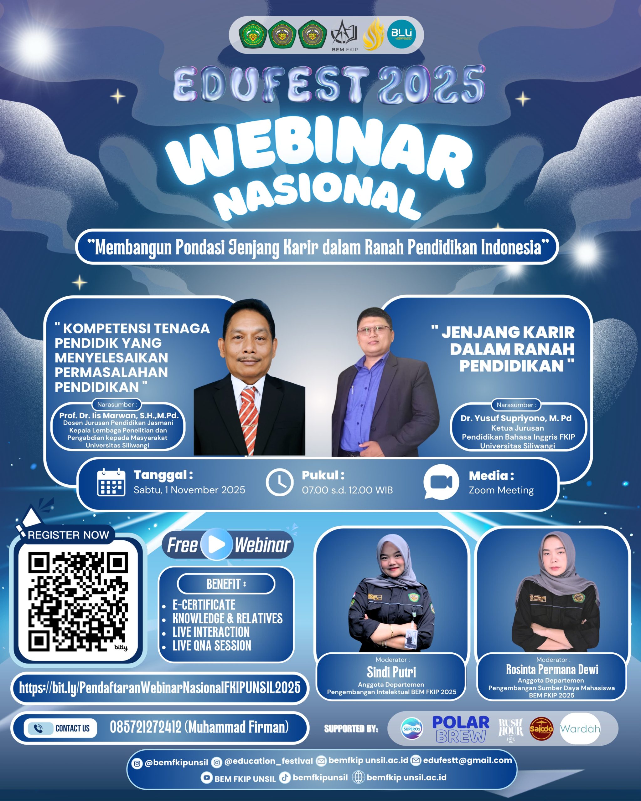 Program Studi Pendidikan Bahasa Inggris, Fakultas Keguruan dan Ilmu Pendidikan Universitas Siliwangi, sukses menyelenggarakan Webinar Nasional 2025 bertema “Membangun Pondasi Jenjang Karir dalam Ranah Pendidikan Indonesia” pada Sabtu, 1 November 2025 secara daring melalui platform Zoom Meeting.